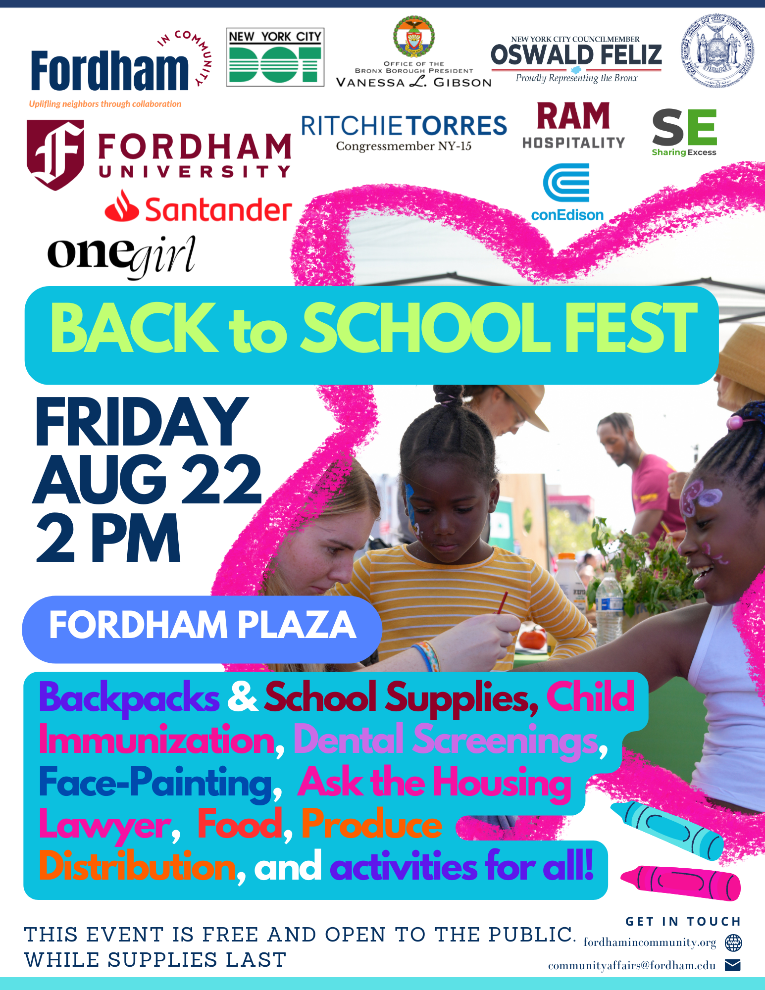 Acompáñenos para el 4to Festival Anual de Regreso a Clases, el 22 de agosto, a partir de las 2:00 pm, en Fordham Plaza en el Bronx, NY. ¡Este emocionante evento está diseñado para iniciar el nuevo año escolar con gran entusiasmo! Traiga a su familia para disfrutar de una variedad de actividades, que incluyen distribución de mochilas y útiles escolares, la oportunidad de obtener identificaciones para menores, pintura de caritas, opciones de comida gratis y una variedad de actividades para todas las edades. No se pierdas esta increíble ocasión, ya que es gratuita y abierta al público. Recuerde, los suministros son limitados, ¡así que asegúrese de llegar temprano para asegurar su lugar!